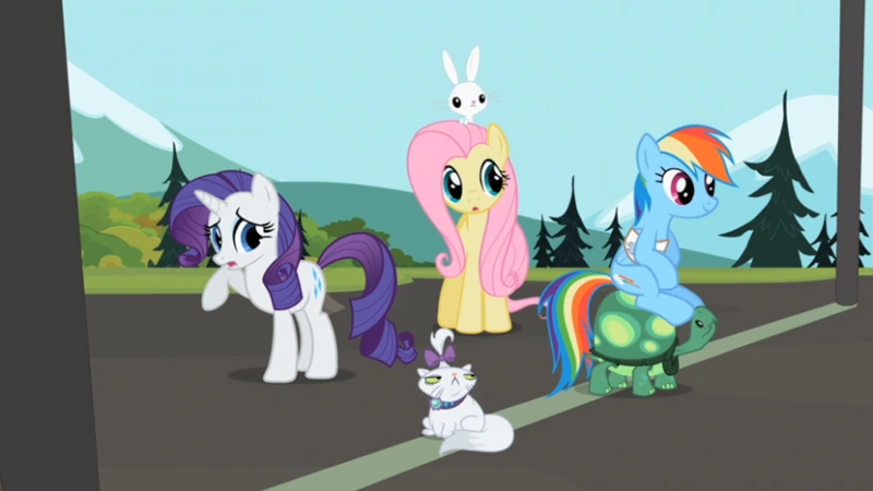 Alla linea del traguardo, gli amici di Rainbow Dash attendono il suo arrivo. Notando come soltanto quattro concorrenti abbiano concluso la gara, cominciano a preoccuparsi per Rainbow. Applejack avvista la frana di massi con il binocolo di Twilight Sparkle, ma vede anche Rainbow Dash a cavallo della testuggine con l'ala destra fasciata. Rainbow Dash e la testuggine concludono la gara, e gli altri pony incitano Rainbow ad incontrare il suo nuovo cucciolo, il falcone. Tuttavia, Rainbow Dash non è soddisfata del falcone come suo cucciolo, anche se è tutto ciò che lei desiderava. Ella afferma che il nuovo cucciolo sarebbe stato quello che avrebbe concluso la gara con lei, e soltanto la testuggine l'ha fatto. Per questo motivo, accetta la testuggine come suo nuovo cucciolo, ringraziandola per averla salvata. Il falcone intristito stringe la zampa con la testuggine e si allontana. Rainbow Dash chiede poi a Spike di scrivere una lettera a Princess Celestia, dicendole di aver appreso che la qualità più importante in un cucciolo non sono le sue abilità fisiche, ma è la sua capacità di resistenza unita all'intelligenza, facendo pensare alla favola della lepre e della tartaruga, dove "colui che è lento e costante vince la gara".