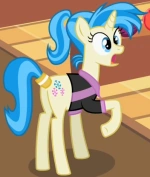 Vista in Lezione Numero Zero mentre prova a prendere Saputellina. I colori del manto e della criniera corrispondono allo schema dei colori sia di "Cloud Kicker" che di una ragazza umana che appare in My Little Pony Equestria Girls. Il suo cutie mark è una lira. | |||