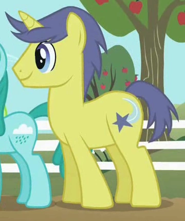 Appare in Dolce Come la Crema, in Festa dell'Amicizia, in L'Ultimo Raduno vicino a Twilight Sparkle nella folla, in The Super Speedy Cider Squeezy 6000 mentre attende in fila e successivamente mentre dichiara che non pagherebbe un centesimo per lo "schifo" prodotto da Flim e Flam, in Era Ora mentre scappa da Cerbero, in Un Matrimonio a Canterlot - Parte 2 quando i Mutanti vengono cacciati da Canterlot, in Una mela marcia mentre guarda la Parata del Raccolto Estivo, in Duello magico ed in Notte insonne a Ponyville. ha lo stesso stile della criniera, colore degli occhi e cutie mark di "Stormfeather", lo stesso design di "Written Script", "Mochaccino" e "Bright Idea", e lo stesso stile della criniera di "Chocolate Haze", "Klein", "Green Gem" e "Silver Script". Ha lo stesso nome di un pony di terra della terza generazione. Il suo cutie mark è una stella cadente. |